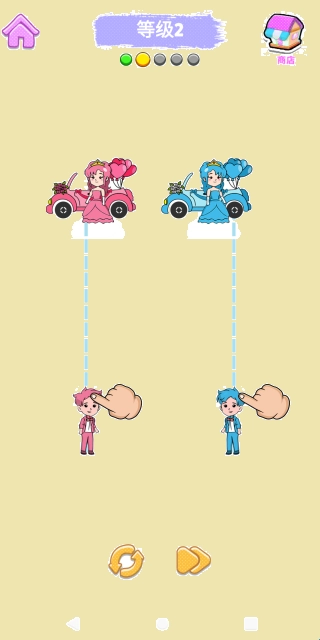 如下圖所示,玩家需用手指在屏幕上畫(huà)線,幫助新郎順利移動(dòng)到新娘所在位置,即可完成關(guān)卡挑戰(zhàn)。