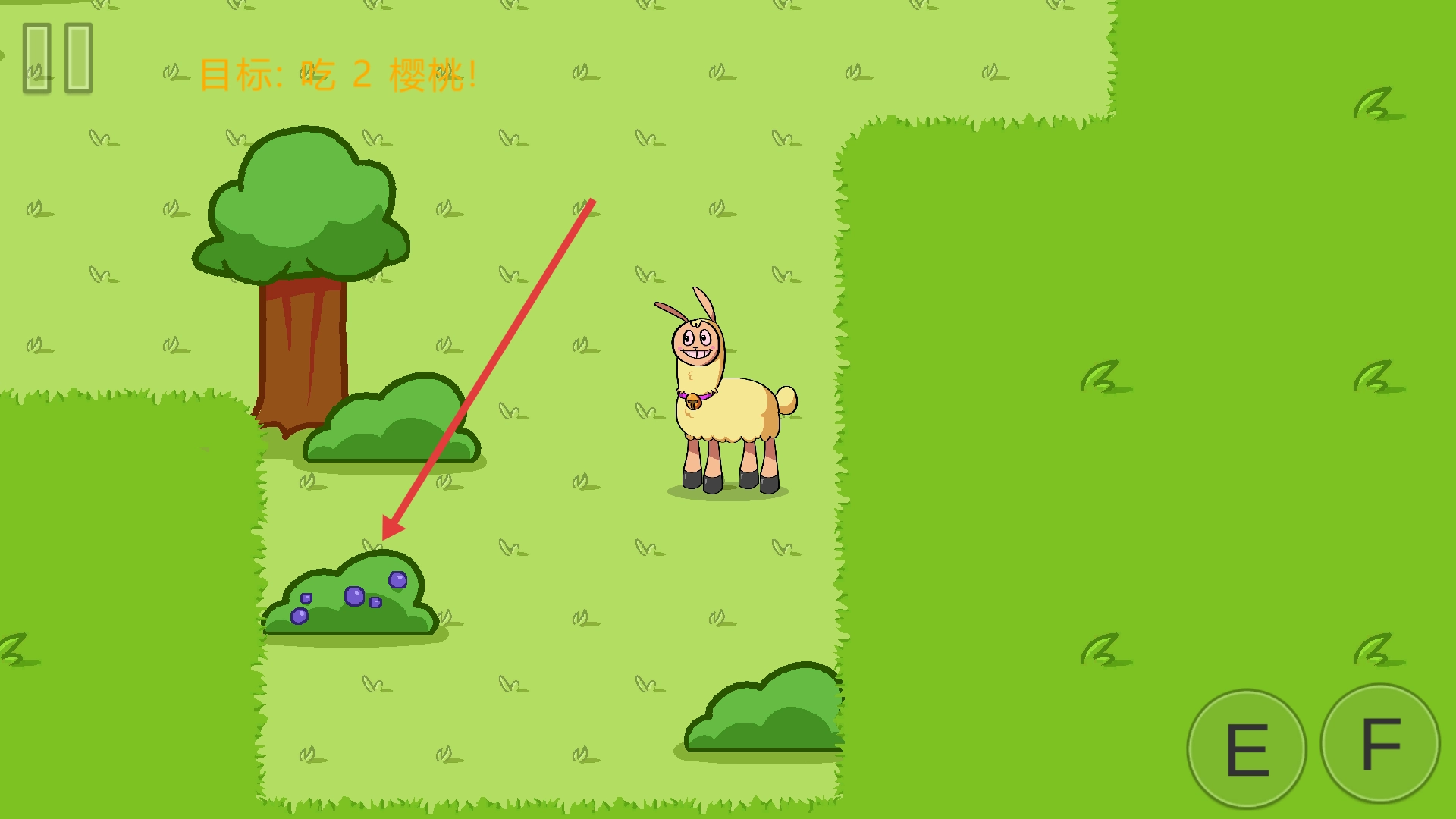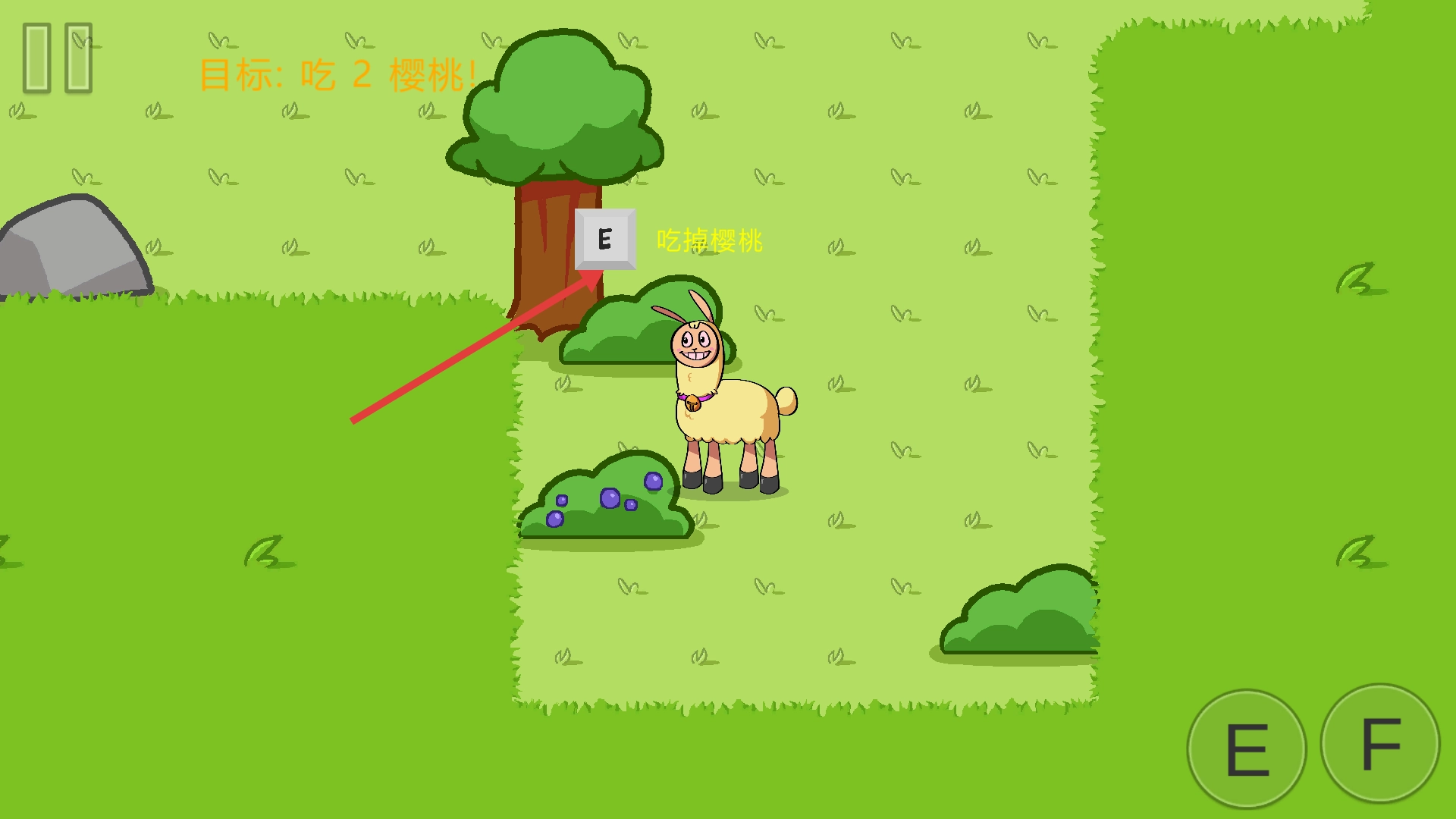 當羊駝靠近櫻桃時,按下E鍵吃掉櫻桃,直到完成吃掉兩顆櫻桃的目標,這樣就能推進劇情了。