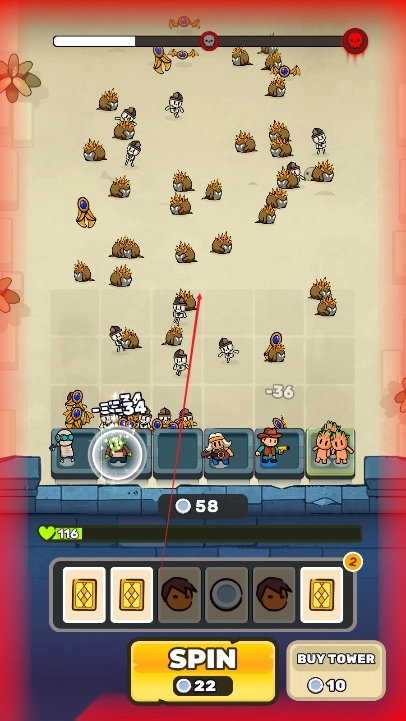 英雄成長的深度體現(xiàn)在英雄與防御塔的“協(xié)同機(jī)制”上,這為養(yǎng)成過程增添了層次感——除了通過合并英雄提升戰(zhàn)力外,讓不同英雄入駐特定類型的防御塔,還能激活專屬增益效果(例如射手英雄進(jìn)入箭塔后射程會翻倍)。隨著轉(zhuǎn)軸的升級,玩家可以解鎖稀有度更高的英雄,進(jìn)而打造出多樣化的戰(zhàn)隊,以此適配不同的戰(zhàn)斗場景,同時滿足收集與養(yǎng)成的雙重需求。