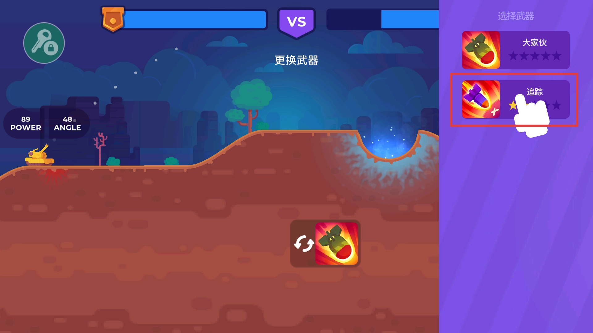 在對(duì)戰(zhàn)過(guò)程中,點(diǎn)擊界面上的【更換武器圖標(biāo)】,接著從右側(cè)的武器列表里挑選【追蹤】類型的武器,這樣能夠提高攻擊的精準(zhǔn)程度,從而更有效地對(duì)遠(yuǎn)處的對(duì)手發(fā)起打擊。