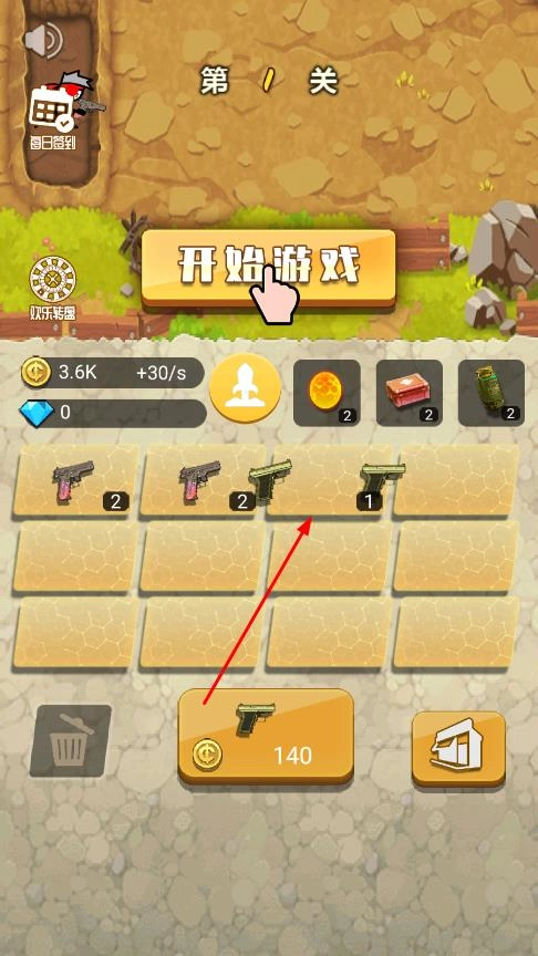 進(jìn)入界面后,中間設(shè)有開始游戲按鈕,點(diǎn)擊此按鈕即可進(jìn)入戰(zhàn)斗準(zhǔn)備階段。在該階段,你能夠購(gòu)買武器并放置到格子里,通過合并等級(jí)相同的武器,就能提升武器的等級(jí)。