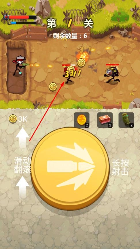 你將操控火柴人角色參與戰(zhàn)斗,界面下方設(shè)有操作按鈕提示。長(zhǎng)按對(duì)應(yīng)按鈕可進(jìn)行射擊,通過滑動(dòng)操作能讓角色翻滾以躲避敵人的攻擊。敵人會(huì)在場(chǎng)景中出現(xiàn),你需要通過射擊來擊敗他們,成功擊敗敵人后還能獲得金幣獎(jiǎng)勵(lì)。