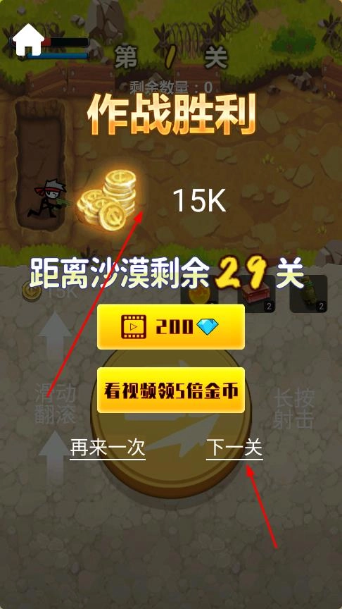 當(dāng)成功消滅本關(guān)的全部敵人后,會(huì)彈出作戰(zhàn)勝利的界面,同時(shí)你將得到金幣獎(jiǎng)勵(lì)。此時(shí)點(diǎn)擊“下一關(guān)”按鈕,即可開啟新一輪的關(guān)卡挑戰(zhàn)。