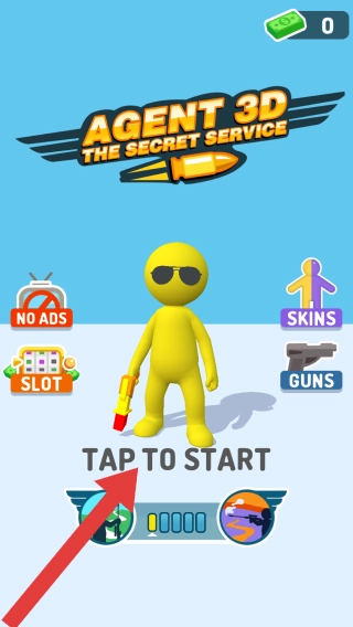 實(shí)體信息包含:名稱為“NOADS”“SLOT(老虎機(jī)/插槽)”“SKINS(皮膚)”“GUNS(槍支)”的功能按鈕,“【TAPTOSTART】(點(diǎn)擊開始)”的操作提示,以及金幣顯示內(nèi)容。