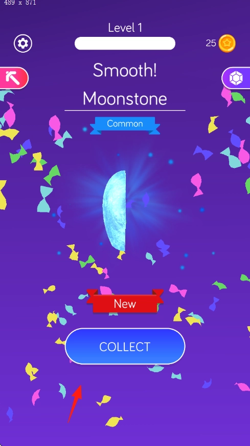 關(guān)卡結(jié)算時挖到了“Moonstone(月光石)”,點擊“COLLECT”按鈕就能領(lǐng)取25金幣的獎勵,同時解鎖新的關(guān)卡。
