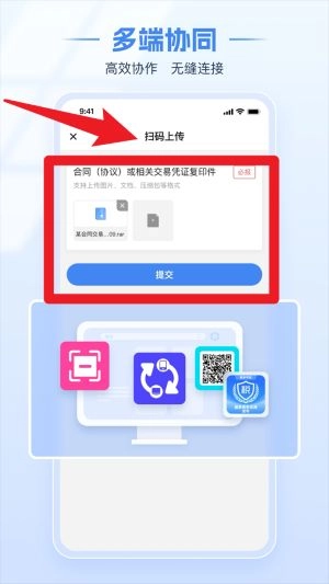 點擊掃碼上傳功能,在上傳合同協(xié)議與交易證明材料的過程中,能夠通過掃碼方式上傳圖像和壓縮文件,從而高效實現(xiàn)多端之間的材料協(xié)同交互。