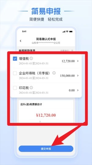 在簡易確認式申報界面,您可以勾選需要申報的稅種,填寫好稅額信息后點擊提交申報按鈕,就能快速完成線上報稅流程。
