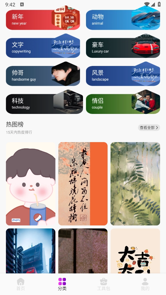 打開軟件后,首頁(yè)和分類頁(yè)面上匯聚了大量熱門壁紙資源,涵蓋動(dòng)物、豪車、風(fēng)景等多種類型。