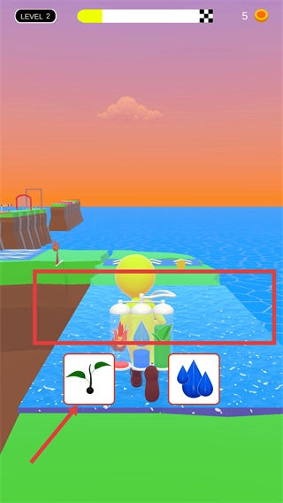 角色進(jìn)入水域路徑后,點(diǎn)擊下方的【草】元素圖標(biāo),釋放對(duì)應(yīng)的元素,以此適配當(dāng)前場(chǎng)景并推進(jìn)關(guān)卡。