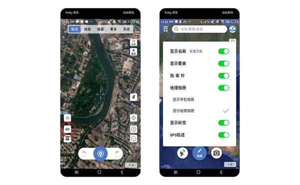在軟件界面的左下角有個“眼睛”圖標(biāo),點擊它就能控制疊加圖層的顯示或隱藏狀態(tài),像矢量標(biāo)注、指南針、地理相冊、手機(jī)相冊、地名標(biāo)簽以及GPS軌跡等圖層的顯示與否都可以通過這個操作來調(diào)整。
