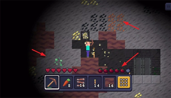 1、進入地圖區(qū)域使用鐵鎬快速挖掘,收集散布的豐富資源。