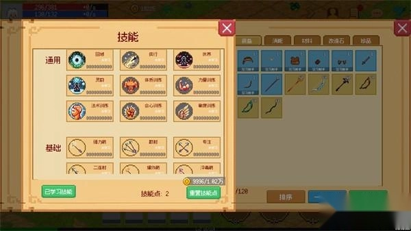 3、角色屬性界面下方選擇技能選項,學習新招式消耗1點技能點和金幣。