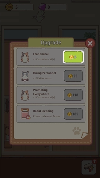 3、升級(jí)酒店:用賺取的收益升級(jí)酒店的設(shè)施,解鎖更多的房間和服務(wù)項(xiàng)目,擴(kuò)大酒店的規(guī)模,接待更多的貓咪客人。