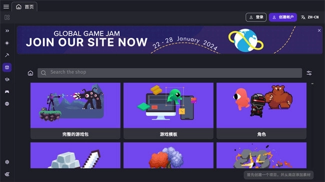 1、新建項(xiàng)目:打開軟件后可以選擇新建空白項(xiàng)目,或者選擇內(nèi)置的模板項(xiàng)目,模板項(xiàng)目已經(jīng)做好了基礎(chǔ)的邏輯,可以直接修改內(nèi)容快速生成自己的游戲。