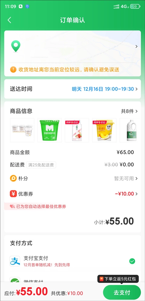 配送時(shí)長(zhǎng)方面,大部分訂單大約半小時(shí)就能送達(dá),不過(guò)高峰期可能會(huì)稍慢一些,但多數(shù)情況下速度還是比較快的。另外,也支持預(yù)約指定時(shí)間配送。