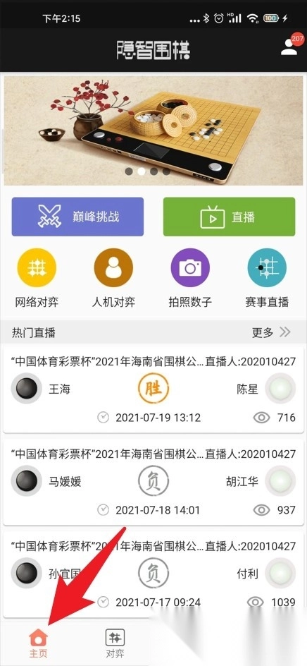 首頁設(shè)有巔峰挑戰(zhàn)、對弈直播、人機對戰(zhàn)等熱門功能的入口。