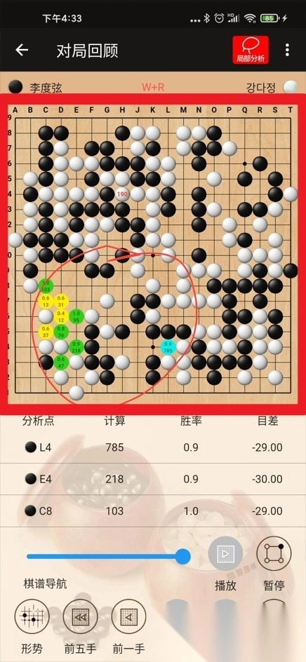 在對局回顧環(huán)節(jié),AI會對關(guān)鍵落子點進行標記,同時呈現(xiàn)勝率的變化情況以及目差的分析內(nèi)容。