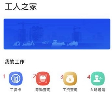 這是桂建通工人端的首頁,工人能夠通過這個頁面進入各個功能模塊開展操作,具體涵蓋工資卡綁定、考勤信息查詢、工資明細查詢以及入場邀請查看等功能。