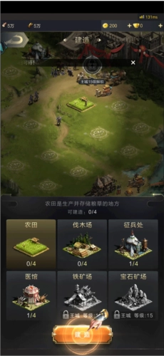 進入亂世王者游戲后,第一步是在空地上搭建農田、伐木場這類設施,以此增加我方的資源儲備。