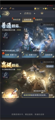 想要提升自己軍營的戰(zhàn)斗力,你還得在點將臺里招募更多厲害的武將和神將。