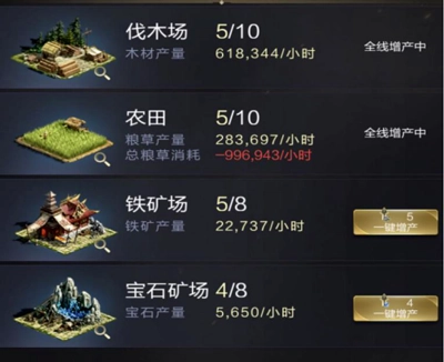 提升糧田、木場、寶礦、鐵田的等級能夠快速增加資源產出,為升級大型建筑提供充足的資源支持。基礎建筑等級的提升,對提升戰(zhàn)力有著顯著的幫助,還能為后續(xù)的發(fā)展奠定堅實的基礎。(ps:別忘了使用資源增產道具哦)