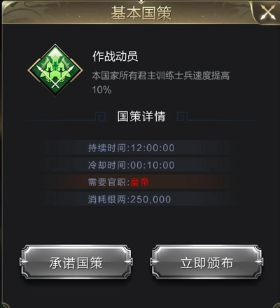 皇城爭奪結束后,皇帝能夠開放若干國策,像提升全服玩家訓練速度的【作戰(zhàn)動員】便在其中,國策生效期間進行暴兵能顯著提高效率。