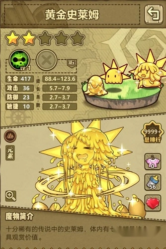 黃金史萊姆,二星魔物,屬于史萊姆的亞種,元素屬性,觀賞價值非常高,嗯~~能用來賣錢~~~