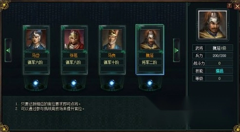 《臥龍吟》最初設(shè)有威望系統(tǒng),魏延的招募需滿足特定威望值要求。之后威望系統(tǒng)與爵位系統(tǒng)進(jìn)行了合并,現(xiàn)在主公們招募魏延需通過爵位系統(tǒng)點將,只要達(dá)到將軍二階就能免費招募該武將。