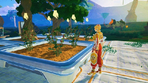 獲得植物種子后,就能把它種在各種「種植盆」里。剛種下的植物是幼苗狀態(tài),得細(xì)心照料才能長大,這時候用「水槍」給它澆水,就能促使植物開始生長。