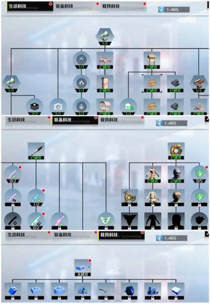 游戲世界里有不少科技需要我們用研究點去解鎖。研究生活、裝備、載具這些科技,能讓我們的外星生活更方便,也能讓自己變得更強??紤]到初期我們比較弱小,獲取研究點的方式不多,所以可以先把重點放在生活科技上,先解鎖組裝臺、火焰工具、水槍工具這些生存必需的物品,再慢慢解鎖床、水箱、淋浴、馬桶、篝火之類的生存用品。等生存需求解決了,就可以根據(jù)自己喜歡的玩法,專門去解鎖某一個科技分支。