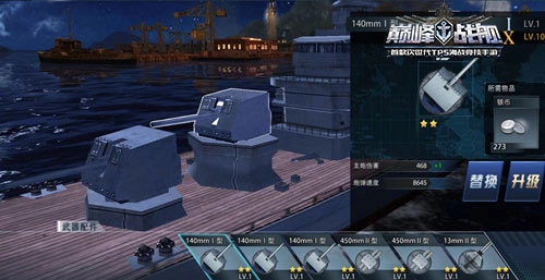 右上角設(shè)有四個(gè)基礎(chǔ)配件,當(dāng)我們把這些配件全部強(qiáng)化完成后,點(diǎn)擊右側(cè)的“進(jìn)階”按鈕,就能讓戰(zhàn)艦完成進(jìn)階。而在下方的一排區(qū)域,展示的是我們的武器列表,當(dāng)戰(zhàn)艦達(dá)到特定的階級要求時(shí),對應(yīng)的武器位便會解鎖開放。
