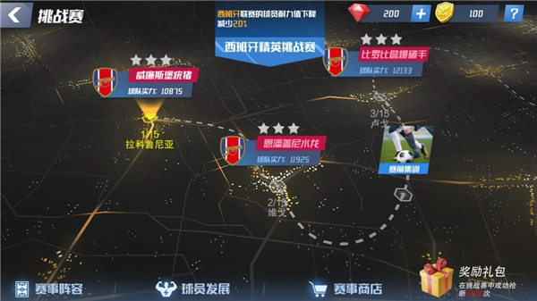 接下來是排位賽環(huán)節(jié),這是我們與其他玩家競技較量的舞臺。如果能擊敗排名高于自己的對手,我們就能取而代之,晉升到對方的排名位置。排名越高,每天能獲得的歐元、寶石和排位幣就越多。需要注意的是,排位賽過程中我們無法實(shí)時操作,所有戰(zhàn)術(shù)執(zhí)行都依據(jù)賽前的預(yù)設(shè)安排。因此,我們得仔細(xì)研究對手的陣容,分析他們可能采用的戰(zhàn)術(shù),提前調(diào)整出一套能克制對方的戰(zhàn)術(shù)方案。除了排位賽,還有巡回賽和挑戰(zhàn)賽:巡回賽要求我們派遣自己的球員加入其他球隊陣容,參與各地的商業(yè)賽事;挑戰(zhàn)賽每天設(shè)有15個關(guān)卡,只有滿足關(guān)卡特定條件完成比賽,才能獲取最豐厚的獎勵,否則只能算作通關(guān),無法拿到全額獎勵。