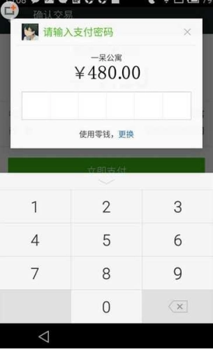 3:確認后,點擊“立即支付”按鈕會彈出輸入密碼的界面,此時可以選擇使用零錢或者銀行卡進行支付。