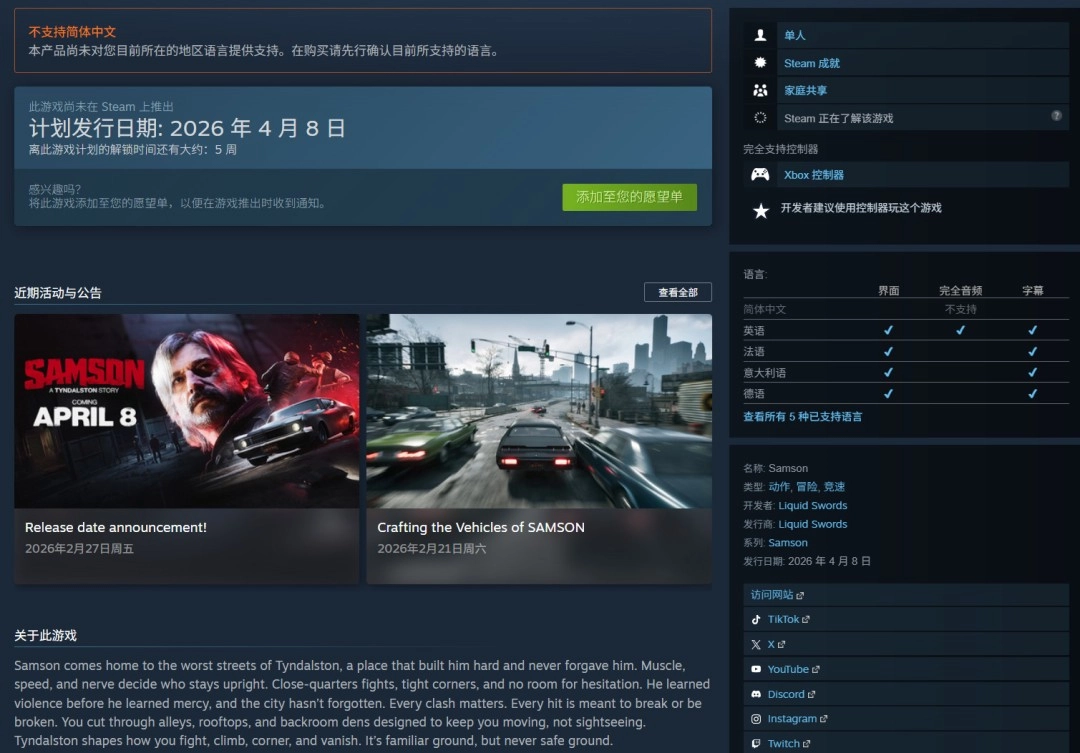 4月8日,黑色動作游戲《Samson:A Tyndalston Story》即將與玩家見面