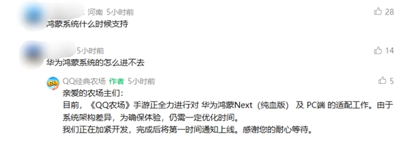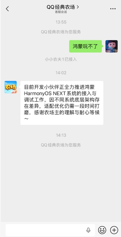 鴻蒙系統(tǒng)無法玩《QQ經(jīng)典農(nóng)場》?官方回應(yīng)稱是系統(tǒng)底層架構(gòu)不同所致,正全力推進