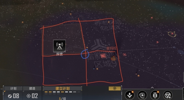 關(guān)于探索時(shí)的技巧,以上圖為例,紅線所畫的田字為探索區(qū)域,我們可以把偵察船調(diào)動到四個格子的交點(diǎn),也就是籃圈的位置,這樣我們只需要依次布下四個相連的計(jì)劃圈,每個計(jì)劃圈在不同的格子內(nèi),就可以在不進(jìn)行額外調(diào)動的情況下探索三個甚至是四個格子了。要注意一次只探一格,一探多格只會給一次的獎勵。