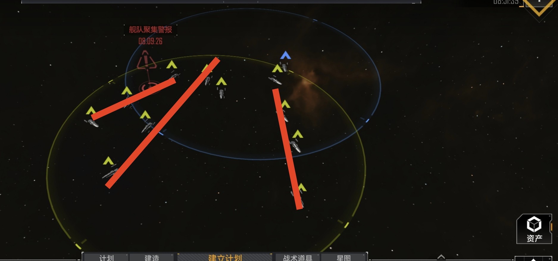 有一個機(jī)制是在對艦隊(duì)下行動指令后會攻擊路上所有非友方目標(biāo),俗稱撞車(聯(lián)合體不會撞車)。這個機(jī)制就可以好好利用,與敵人多個偵查站在一條線上,攻擊最遠(yuǎn)的那個艦隊(duì),這一條線上的敵人都可以被打掉,10點(diǎn)策略干了幾十點(diǎn)策略的活。下圖的偵查,在對方不溜人的情況下,40點(diǎn)策略可以全部清完。