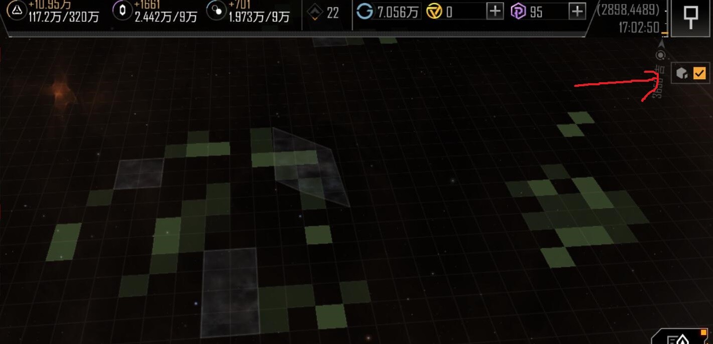 如圖,將戰(zhàn)略地圖視野拉高,點(diǎn)擊箭頭指向的按鈕,可以開啟經(jīng)濟(jì)模式(自己取的名)。其中黑色塊為無資源區(qū),綠色塊亮度與礦點(diǎn)等級有關(guān),越亮等級越高,不過與礦點(diǎn)數(shù)量無直接關(guān)系。根據(jù)這個地圖,就能找到富礦區(qū)。