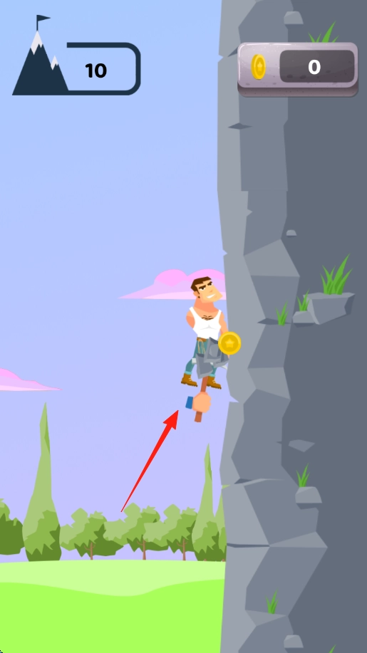 2、攀巖操作在巖壁場景,點(diǎn)擊屏幕讓角色揮斧抓巖點(diǎn),向上攀爬,收集金幣,界面顯示“10→11”關(guān)卡進(jìn)度,注意躲避障礙。
