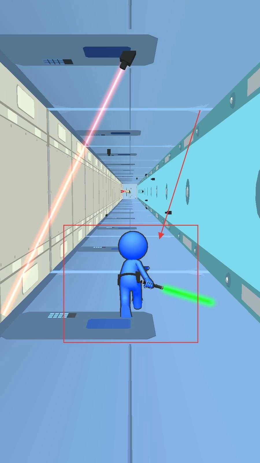 2、玩家在前進(jìn)時,需要注意躲避天花板射出的紅色激光,靈活移動藍(lán)色小人進(jìn)行空間移動,避免被激光擊中。