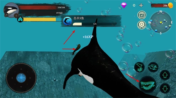 2、操控海洋生物在海域中移動,探索不同區(qū)域,尋找獵物與任務(wù)目標(biāo)。