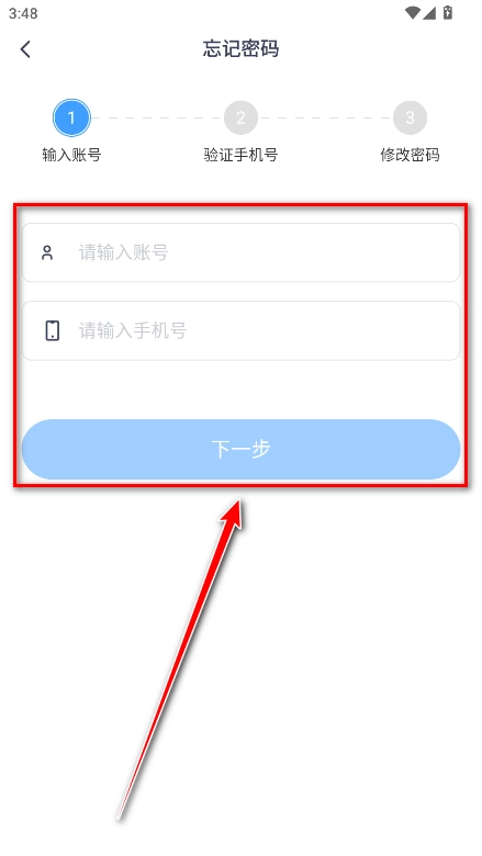 2. 填入賬號與手機號,點擊“下一步”,依照提示進行操作。