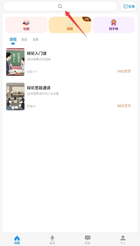 3、在辯論主題頁面輸入關(guān)鍵詞進行檢索,即可查找相關(guān)辯題內(nèi)容參與討論。