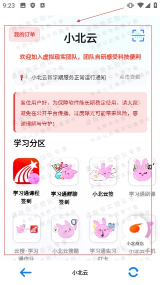 1. 進(jìn)入小北云界面,能夠查看諸如【我的訂單,進(jìn)入學(xué)習(xí)分區(qū)】等功能,進(jìn)而開啟學(xué)習(xí)服務(wù)體驗(yàn)。