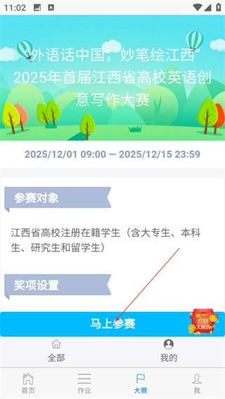 2、在大賽板塊找到寫作大賽入口,點(diǎn)擊進(jìn)入活動(dòng)詳情頁(yè)。