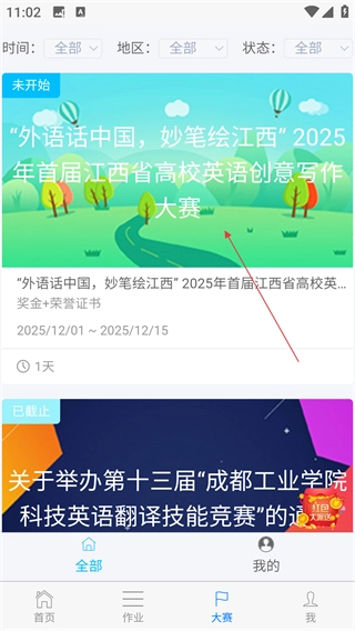 1. 于軟件首頁(yè),輕點(diǎn)【大賽】選項(xiàng),隨即進(jìn)入大賽板塊頁(yè)面。