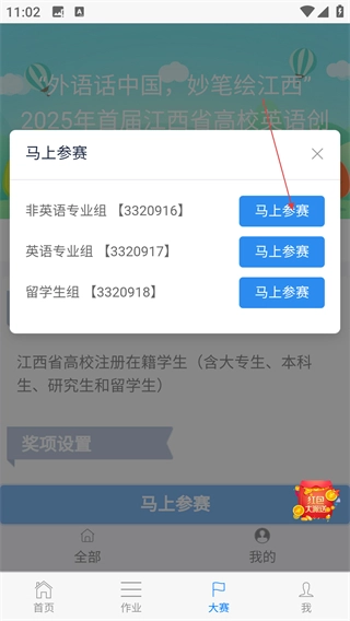 3、在活動(dòng)詳情頁(yè)點(diǎn)擊【馬上參賽】按鈕,進(jìn)入?yún)①惤M別選擇頁(yè)面。