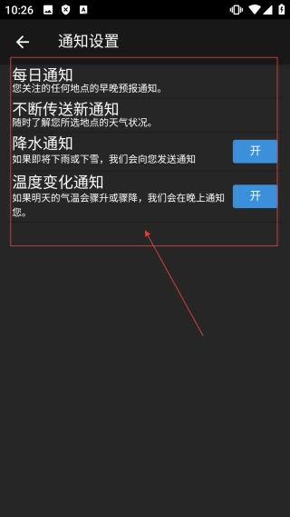 3、進(jìn)入通知設(shè)置界面,能夠【開(kāi)啟降水通知、溫度變化通知】等,從而及時(shí)獲得天氣變化提醒。