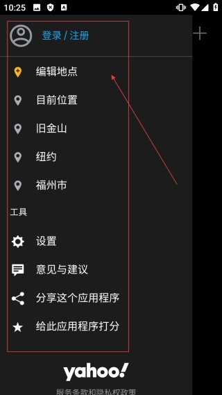 2、進(jìn)入菜單,可【進(jìn)行登錄注冊(cè)、編輯地點(diǎn)、查看設(shè)置】等操作,管理天氣查詢的相關(guān)功能。