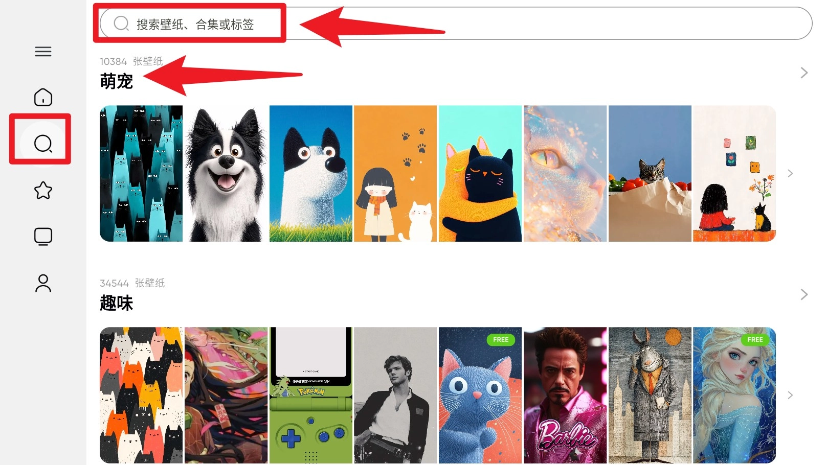 2. 點(diǎn)擊左側(cè)放大鏡圖標(biāo)或頂部搜索框,可輸入關(guān)鍵詞如宇宙、貓咪等快速篩選主題壁紙集合。